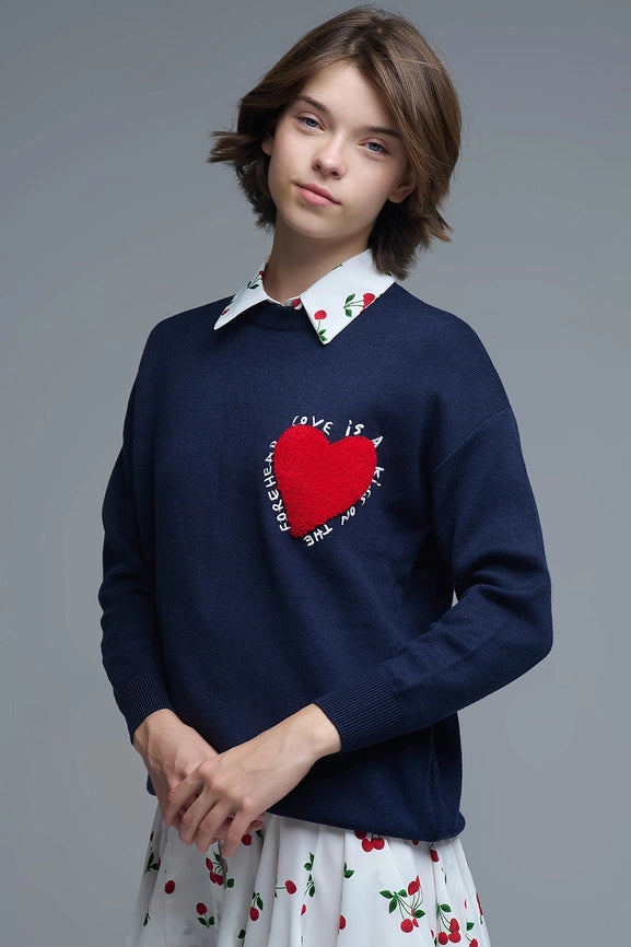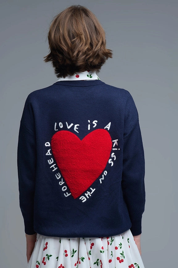 Introducing the navy Embroidered Heart Sweatshirt a stylish and cozy addition to your wardrobe. Featuring a classic crew neck and long sleeves this sweater is made from soft knitted fabric for all-day comfort. The standout detail is the striking red embroidered textured heart on the chest accompanied by the heartfelt phrase: "Love is a kiss on the forehead." The back showcases a large embroidered red heart that elegantly covers most of the surface making a bold statement. Perfect for layering or wearing on its own this sweatshirt beautifully combines style and meaningful sentiment.
