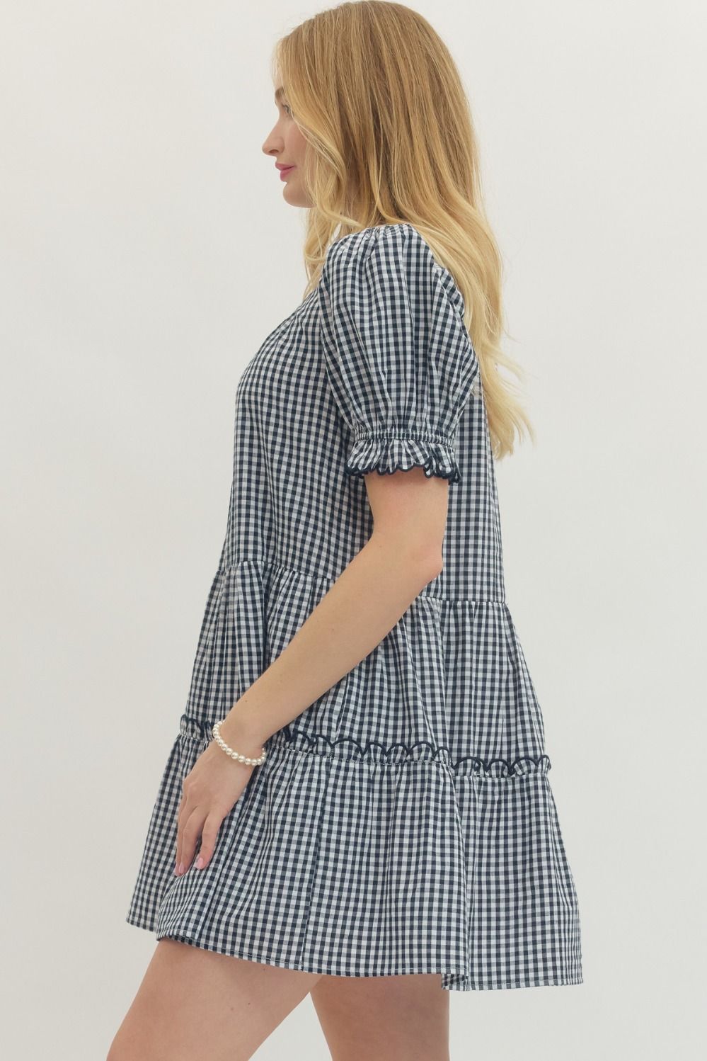 Adorable gingham mini dress that's ready for anything! This charming piece features a ruffled accent neck band with a flattering V-neck, short puff sleeves, and convenient front button closure. Practical side pockets keep your essentials close, while the lined, non-sheer woven fabric ensures comfort and coverage. Lightweight and effortlessly chic, it's the perfect go-to for casual outings, weekend adventures, or whenever you want to add a touch of vintage-inspired fun to your wardrobe.